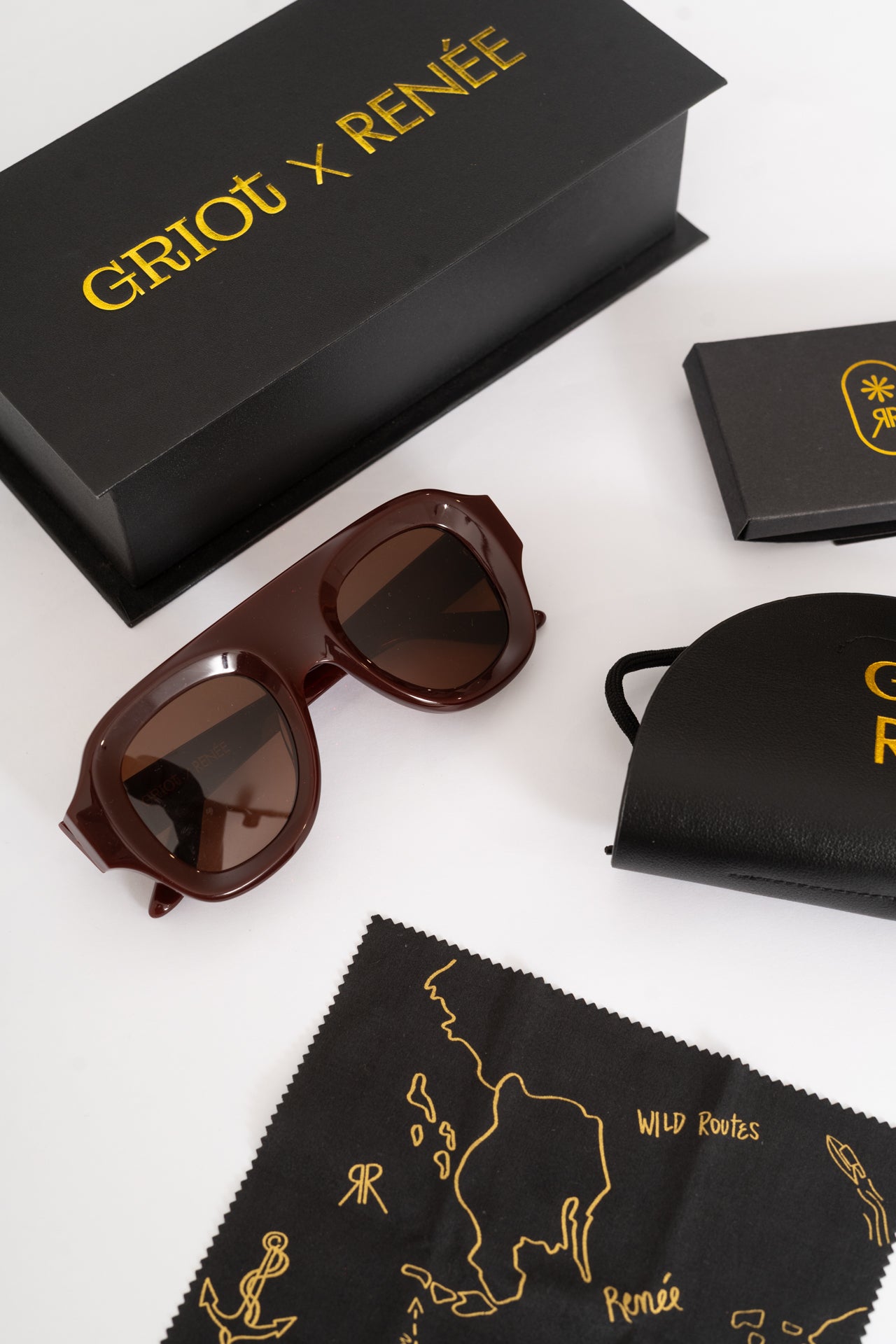 Se entregan en un packaging único y exclusivo GRIOT CLUB x RENÉE, diseñado especialmente para esta cápsula. Incluye estuche rígido, funda protectora y paño de microfibra personalizados que completan este producto premium.